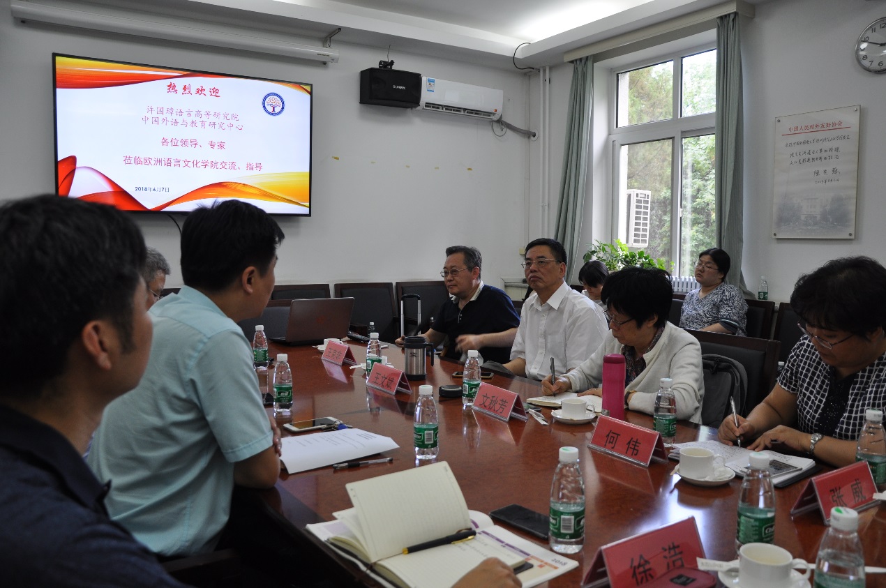 6月7日下午,许国璋语言高等研究院、中国外语与教育研究中心领导和部分专家到必赢nn699net进行交流调研。参加活动的有校学术委员会主席兼许国璋语言高等研究院院长文秋芳教授、中国外语与教育研究中心主任兼许国璋语言高等研究院副院长王文斌教授、许国璋语言研究院副院长兼《外语教学与研究》主编王克非教授等、研究院院长助理何伟、张威、徐浩和秘书贺佩倩老师。