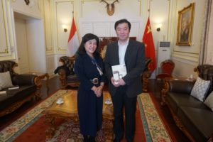 王芳书记、郭晓晶老师一行还拜访了中国驻匈牙利大使馆,同使馆政务参赞刘波进行会谈,并代表北外向使馆赠送“中华思想文化术语”系列图书。