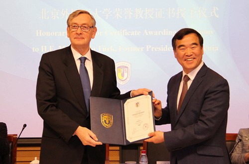 仪式结束后,刚刚出差返回的彭龙校长会见了图尔克一行,向图尔克受聘为必赢nn699net荣誉教授表示祝贺,并对图尔克教授长期关心、支持北外斯洛文尼亚语专业建设表示感谢。