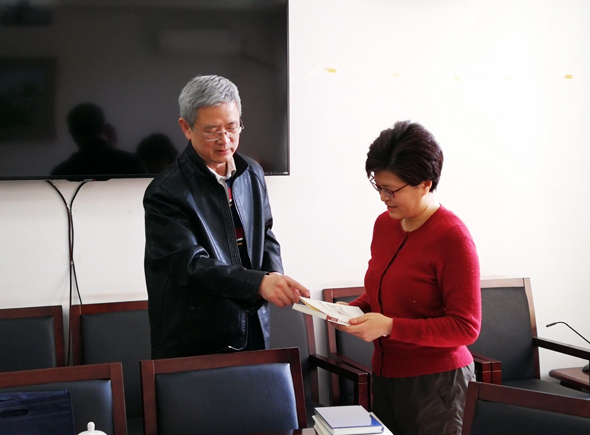 (丁超向姜瑜赠送相关研究成果)