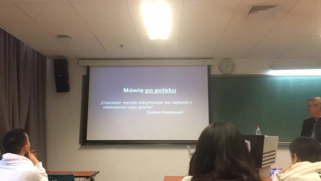 当天下午,雅盖隆大学波兰语言文化中心主任马尔提纽克博士为本科三年级员工做题为“语言作为文化中介的作用——以波兰语为例”的学术讲座。
