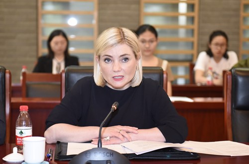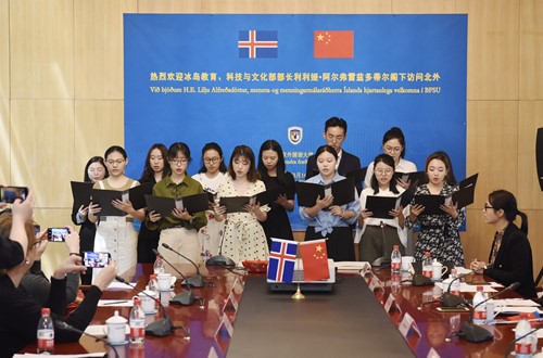 阿尔弗雷兹多蒂尔对北外冰岛语专业建设所取得的成就表示祝贺,她高度评价了北外冰岛语专业的人才培养质量,特别强调了语言文化教学在两国关系中的重要地位。她表示,冰岛政府高度重视北外的冰岛语专业发展,愿意继续给予大力支持。此外,阿尔弗雷兹多蒂尔还介绍了此次访华在文化、教育和体育等方面取得的积极成果。