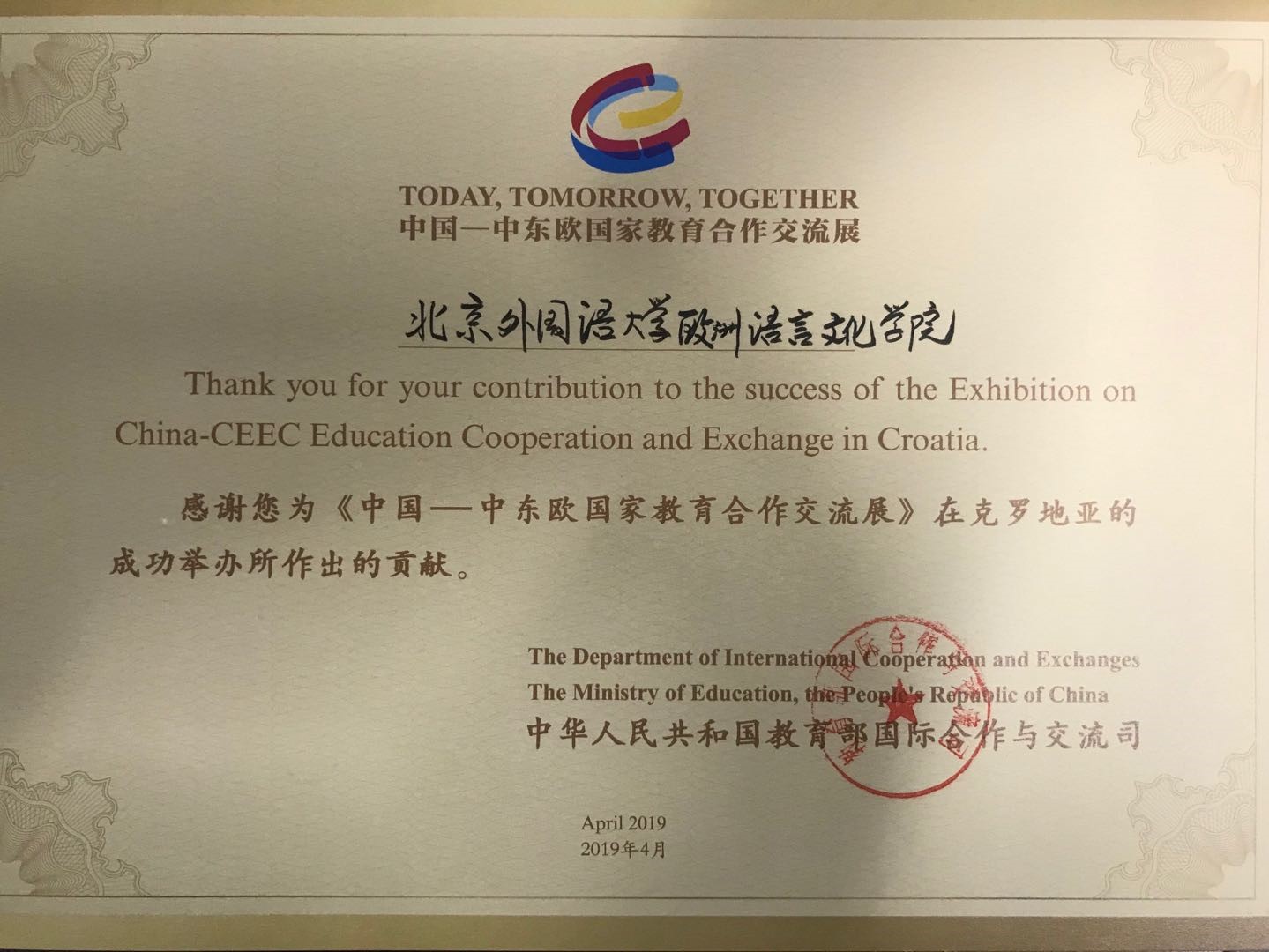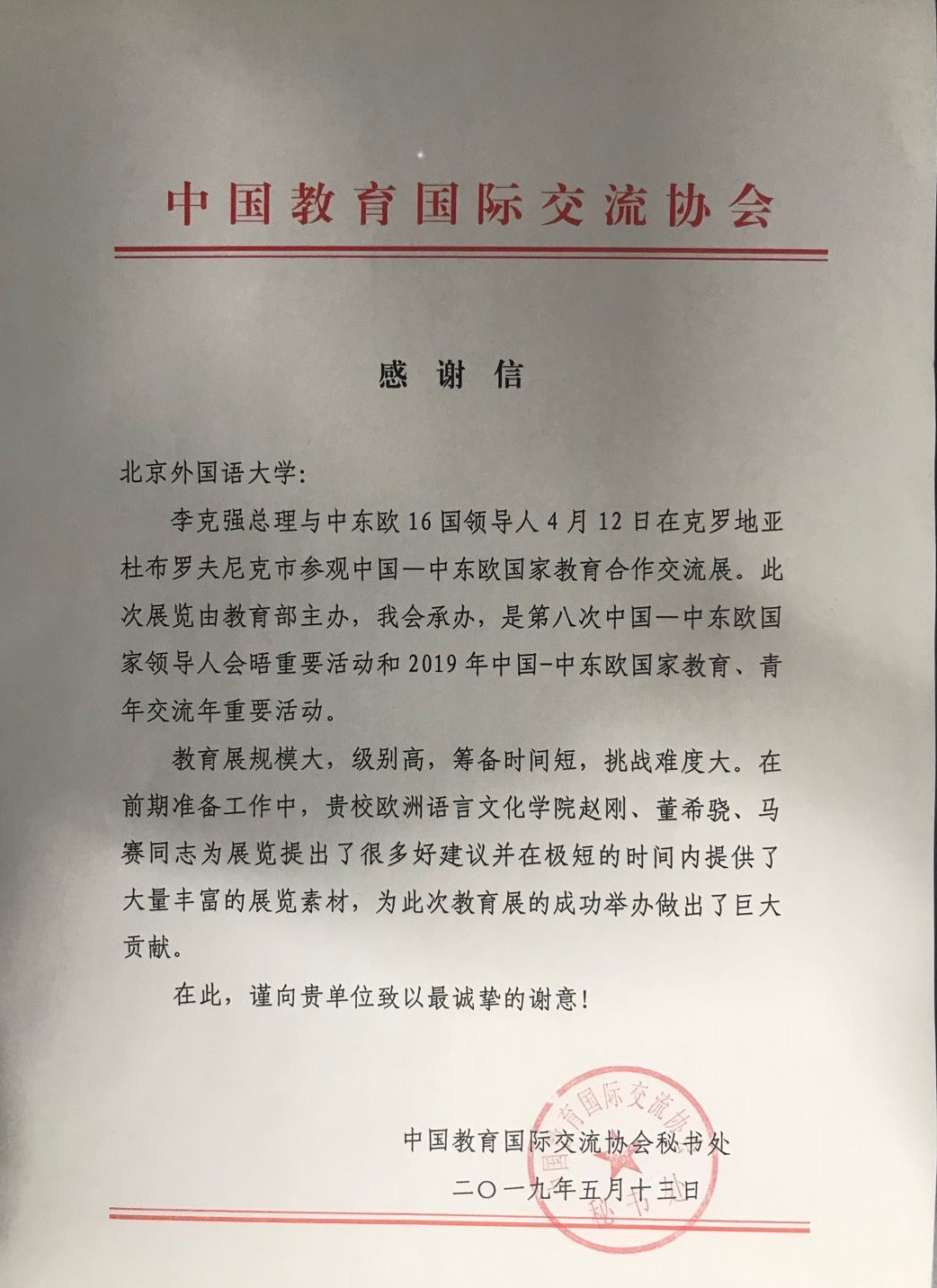 日前,教育部国际合作与交流司和中国教育国际交流协会秘书处分别向必赢nn699net发来感谢信,感谢必赢nn699net在筹办“中国——中东欧国家教育合作交流展”过程中所提供的的大力支持。