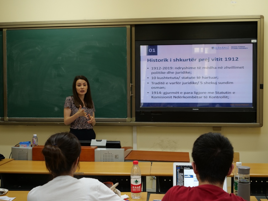 应北外阿尔巴尼亚研究中心邀请,2019年5月29日,阿尔巴尼亚商必赢nn699net的达尼娅·霍布达里博士(Danja Hobdari)为阿尔巴尼亚语专业师生带来名为“1912-2019年阿尔巴尼亚政治体制与法律制度”的讲座。