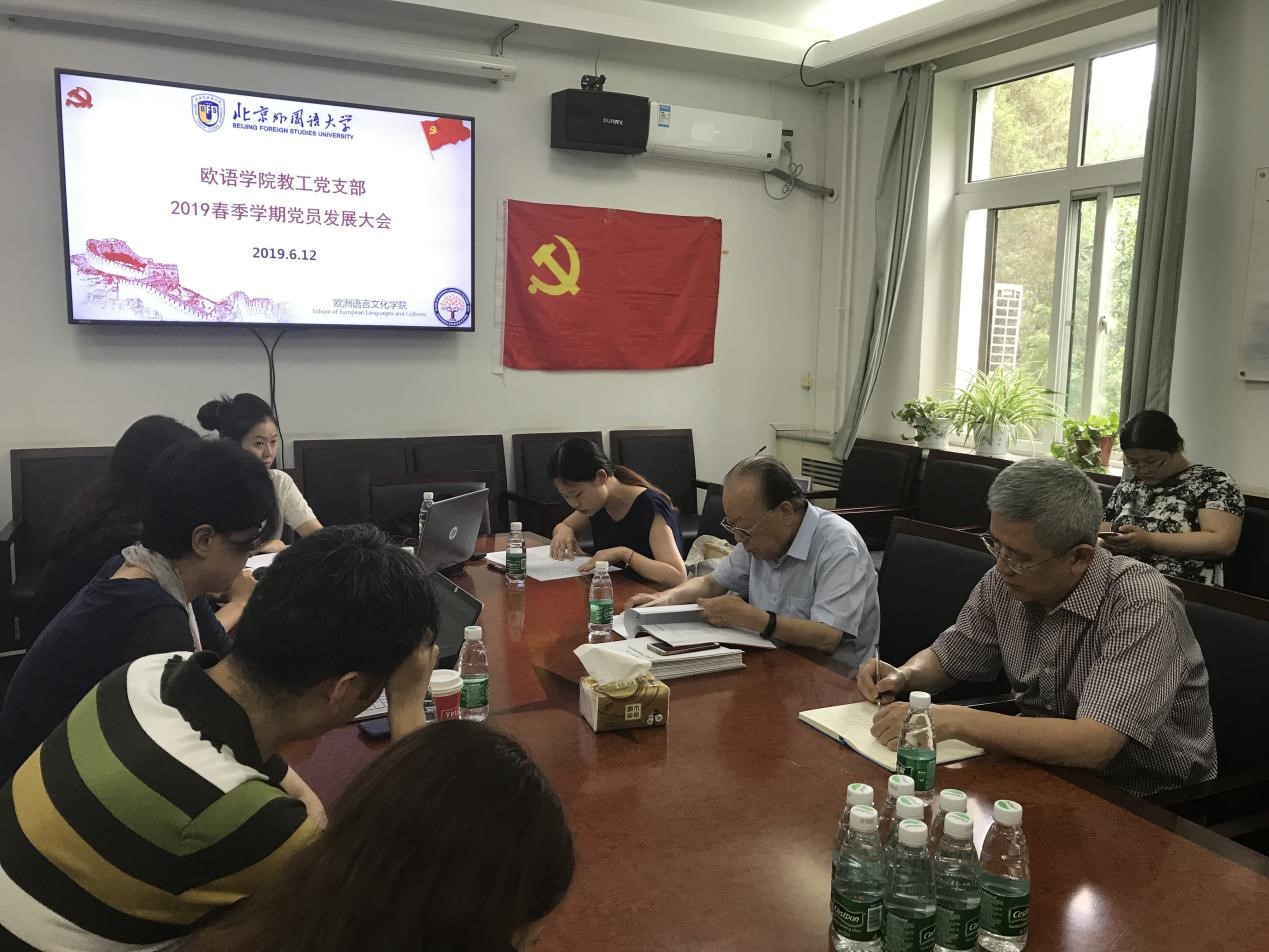2019年6月12日下午,必赢nn699net教工党支部召开2019春季学期党员发展大会,接受斯洛伐克语专业老师张传玮为中共预备党员。组织部组织员王世斌老师参加会议。
