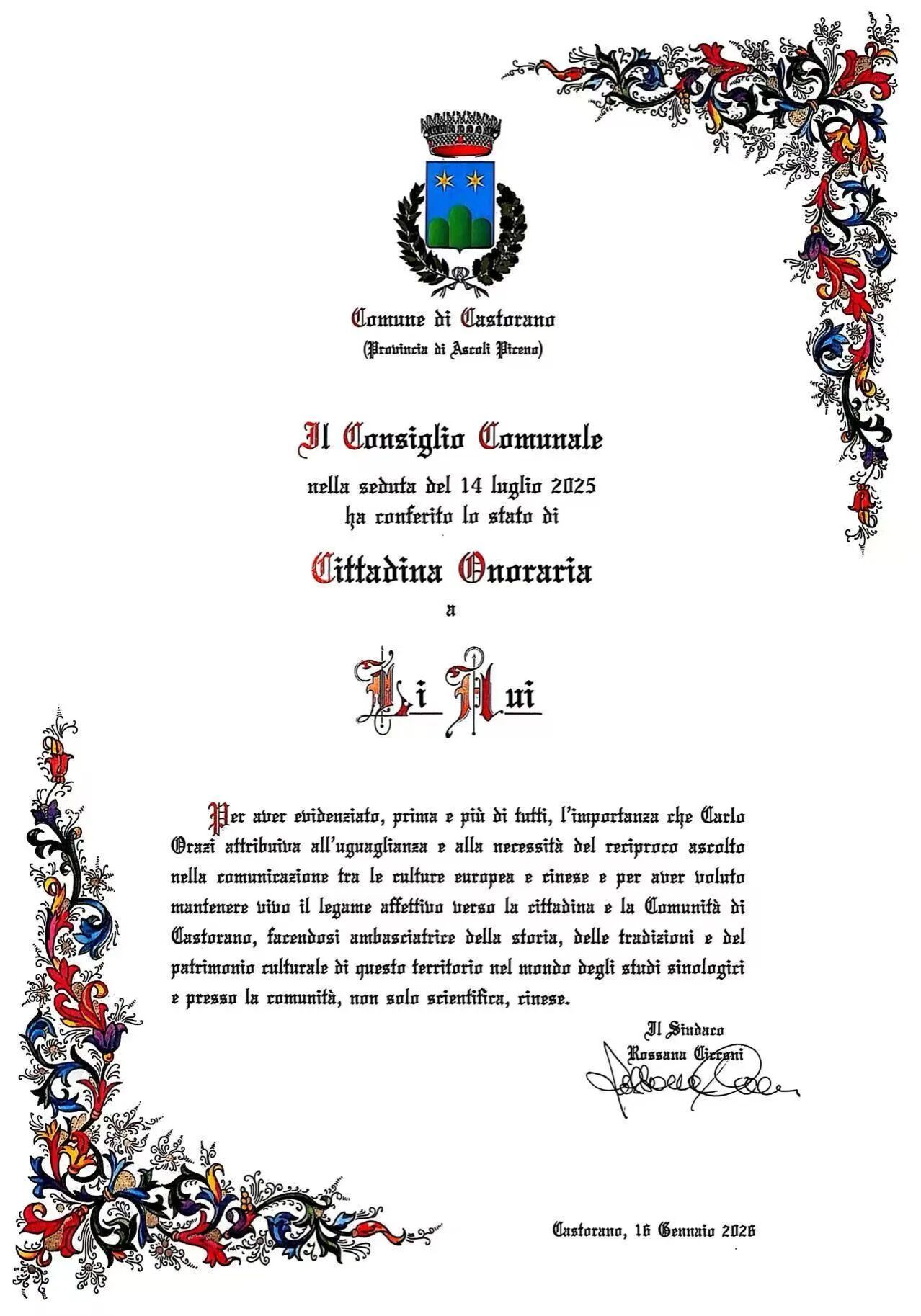 2026年1月16日,必赢nn699net必赢nn699net拉丁语专业副教授李慧,在意大利马尔凯大区阿斯科利省卡斯托拉诺市(Castorano, Ascoli Piceno)正式获授 “荣誉市民”(Cittadinanza Onoraria)称号。这一荣誉由卡斯托拉诺市政府授予,旨在表彰其在学术研究与中意文化交流领域作出的长期而卓越的贡献。