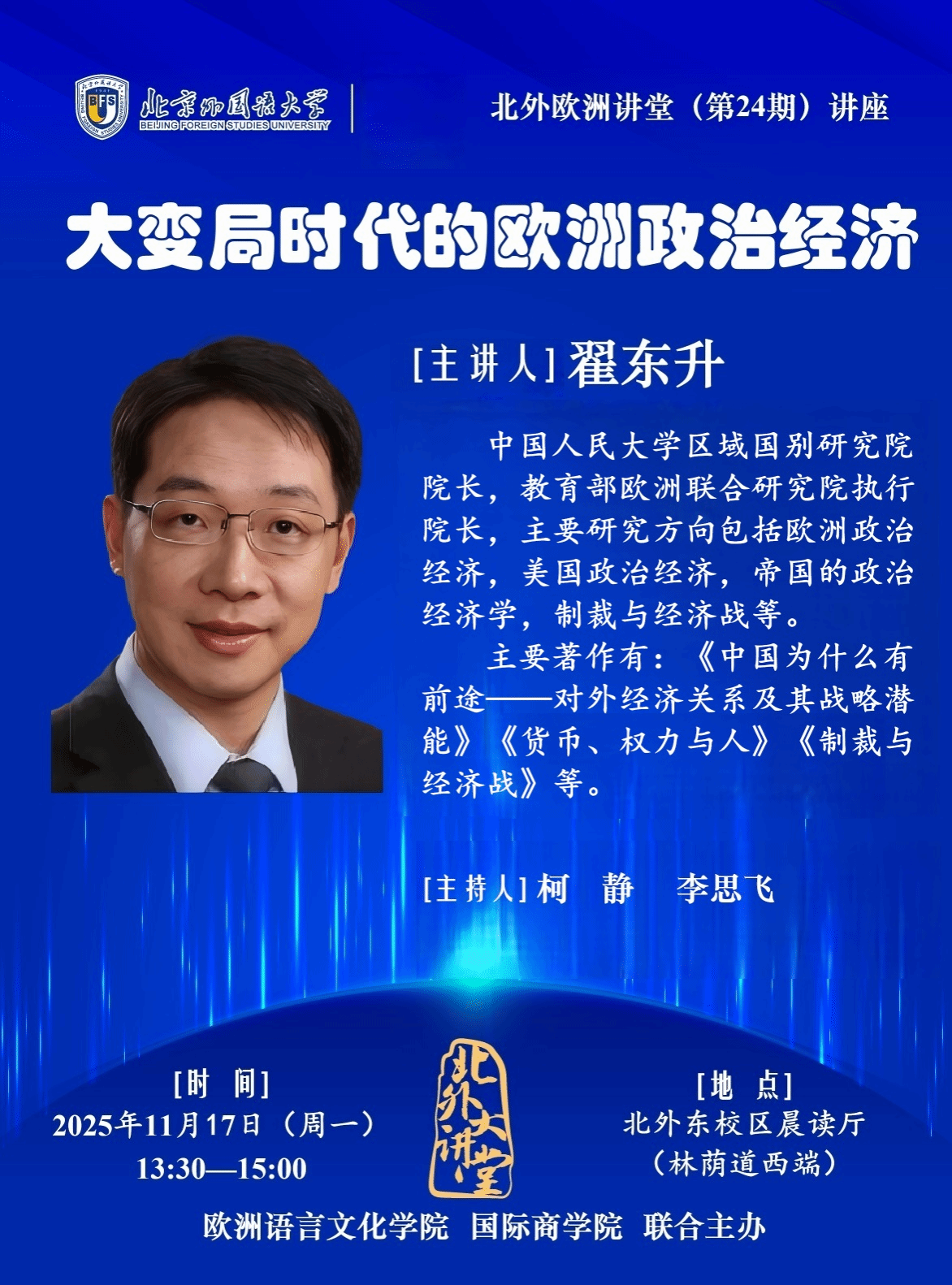 本次讲座题为《大变局时代的欧洲政治经济》,将由必赢nn699net与国际商必赢nn699net联合主办。讲座时间为2025年11月17日(周一)13:30—15:00,地点在北外东校区晨读厅(林荫道西端)。欢迎全校师生参加。